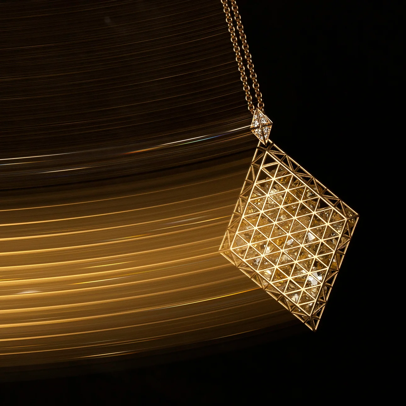 Inspired by universal principles and elegant geometries, the Wired Collection is made up of several distinct but modular lines: the BEVELED and ROULETTE lines are decadence deconstructed; golden vessels showcasing the refractions and colors of gemstones freed from their settings. In the PIXEL DUST and TRELLIS lines, arrays of diamonds (and colored stones) seem to float on grids of gold like constellations in the night sky. The tribal silhouettes and graphic patterns of HALO bangles and pendants make them striking and very collectible statement pieces. The STRATA line elevates simple shapes with refined detail. Filling out the collection are Roule & Company’s retro-futuristic SIGNATURE cabochon rings and chainlinks.